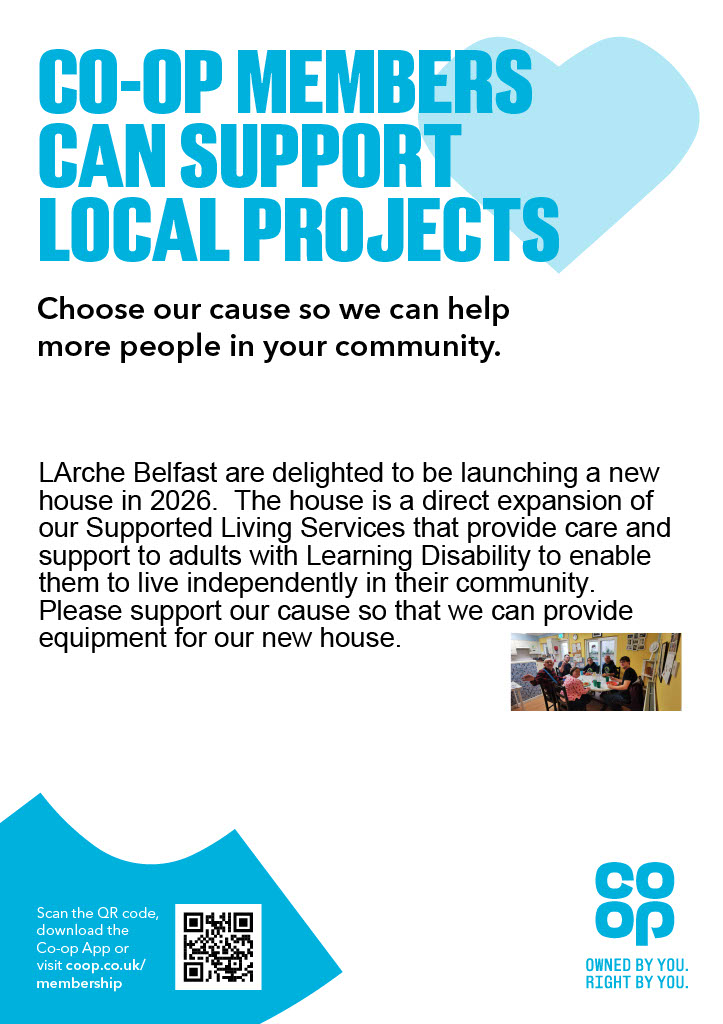 Please Help by choosing L’Arche as your local charity cause. You will be helping us to set up a new much needed supported living project for adults in the Belfast area with learning disability.